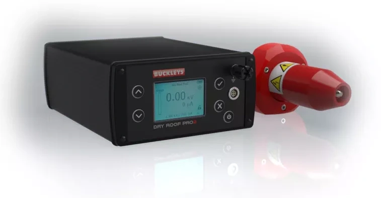 детектор протечек BUCKLEYS DRY ROOF PRO, который при помощи электрического разряда способен быстрого и эффективно найти место дефекта в непроводящих плоских кровельных мембранах и в битумных покрытиях минимальной толщиной от 64 мкм до 25,6 мм.